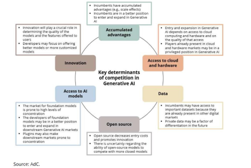 Especially for the AV sector there needs to be access to services by major tech companies. If those block third parties and e.g. use generative AI-tools only within their own offerings this would pose a huge risk and disadvantage to the AV and content industry.In November of last year, the Portuguese Competition Authority, Autoridade da Concorrenza (The “AdC”) published a comprehensive paper on the risks of AI in Competition. The following infographic included in the study summarises the main key determinants of competition in generative AI: