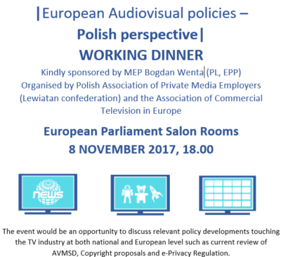 Kindly sponsored by MEP Bogdan Wenta, ACT and Polish Association of Private Media Employers (Lewiatan confederation) organised a working dinner for Polish Members of European Parliament to discuss relevant files for European commercial broadcasters.