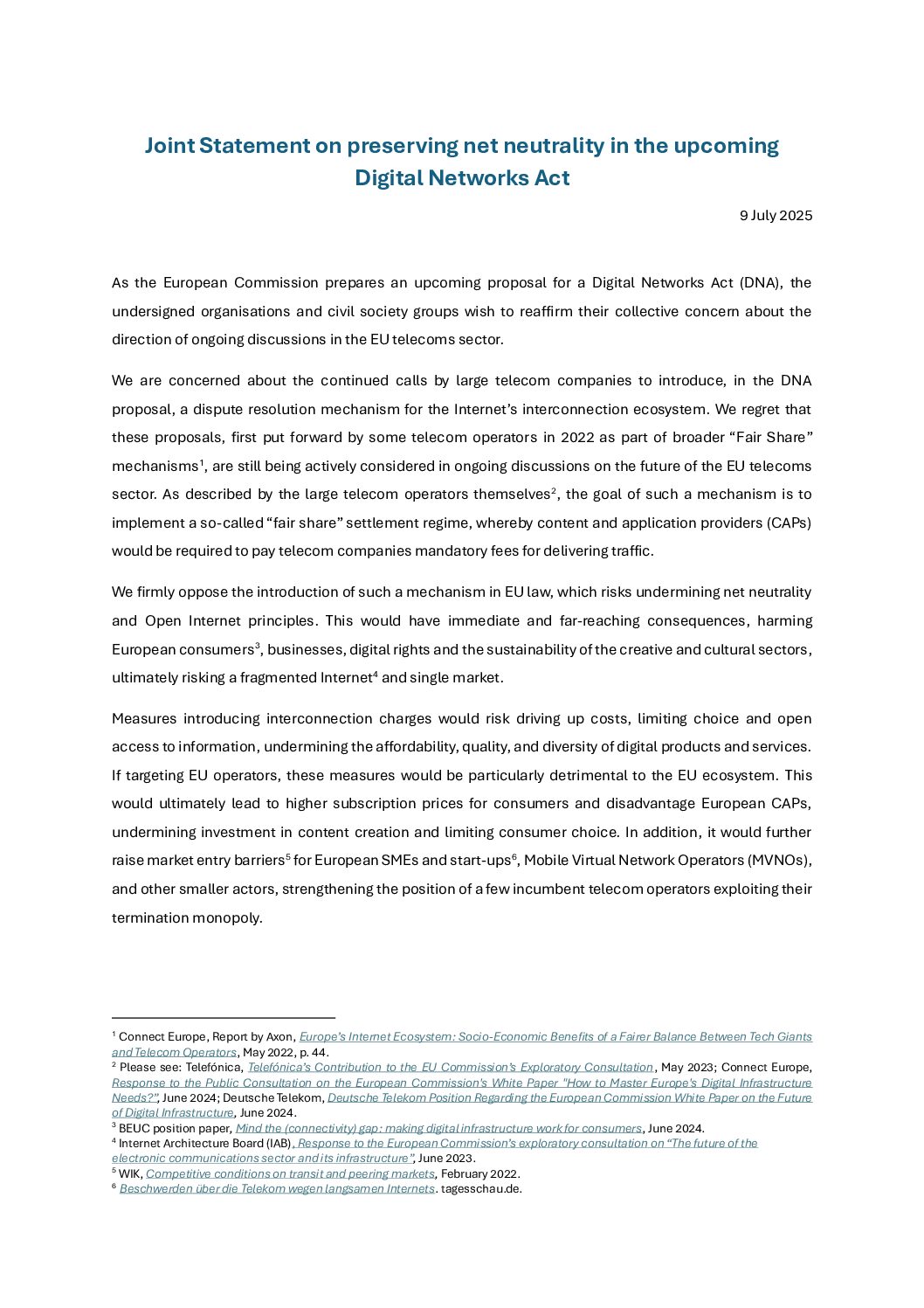 Joint Statement on preserving net neutrality in the upcoming Digital Networks Act