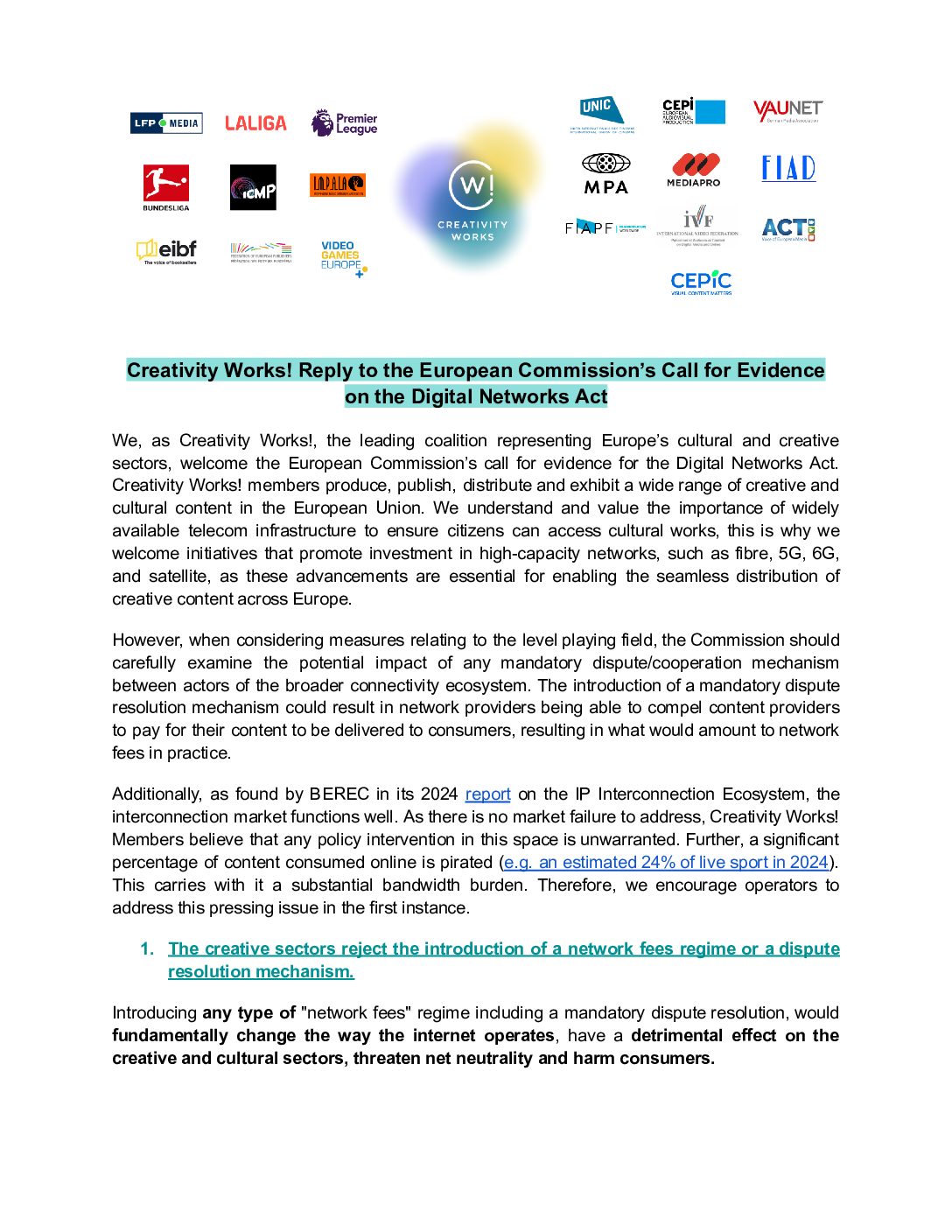Creativity Works! Reply to the European Commission’s Call for Evidence on the Digital Networks Act